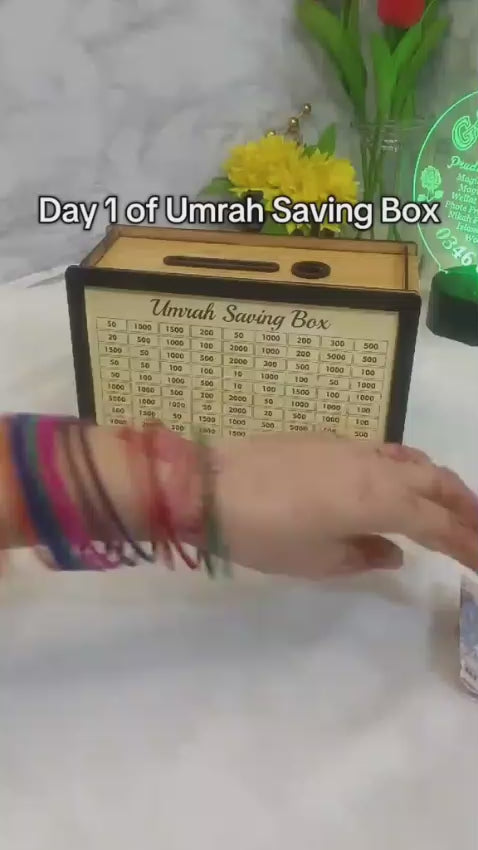 Savings Plan Achieve your Umrah goal step by step Premium Wooden Box Elegant durable & eco-friendly way to save for Umrah Stay motivated as savings grow daily Secure Lockable Design Keeps your money safe until Umrah Perfect Gift for someone Teaches Financial Discipline – Great for families & kids